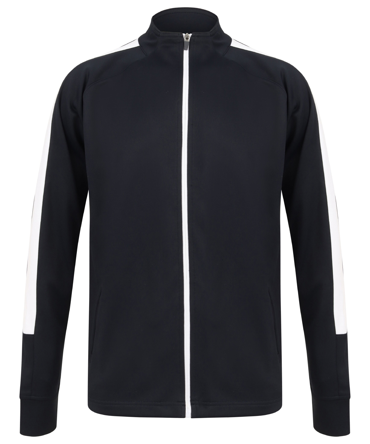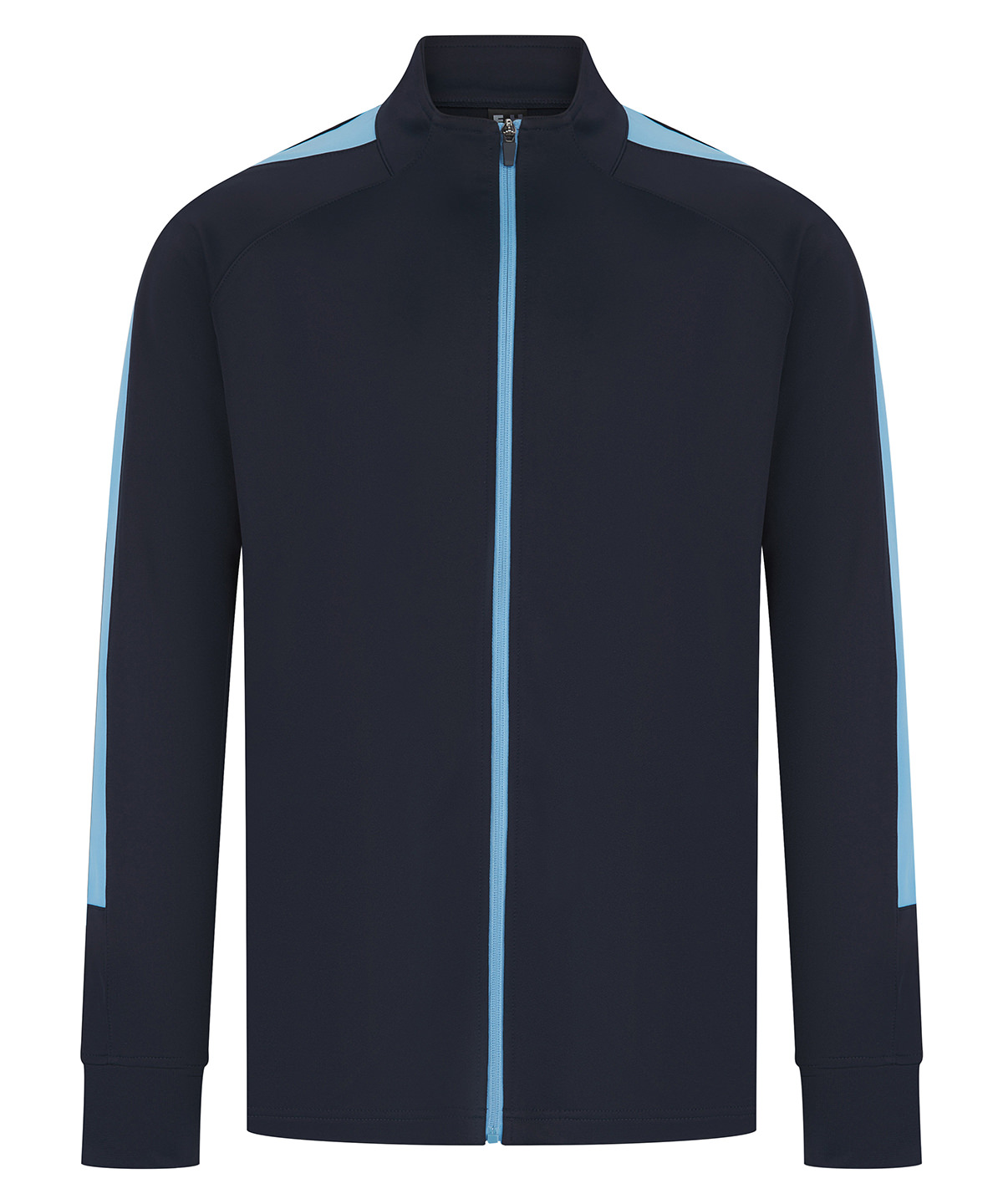 Knitted tracksuit top with contrast colour panels on outer sleeve. Contrast colour centre front zip. Zipped side pockets. Funnel neck and 1×1 ribbed cuffs. Semi-automatic lock zip sliders on all zips.