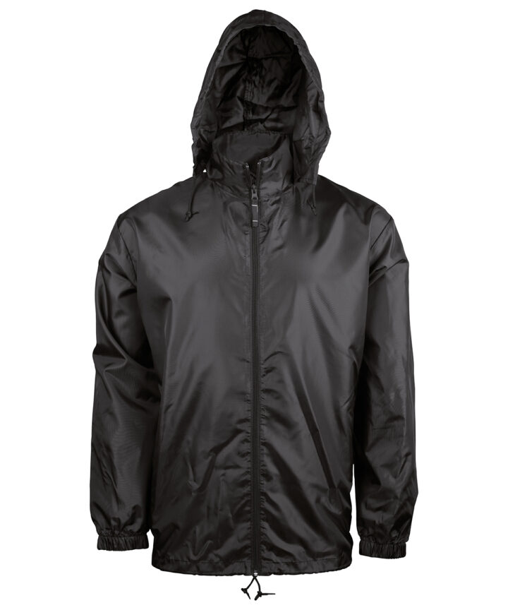 100% polyester. Concealed hood with tear release fastening tab. 2 front zipped pockets. Drawstring at bottom. Elasticated cuffs. Packs/zips into front pocket. Full front zip. BSCI certified. SEDEX certified.